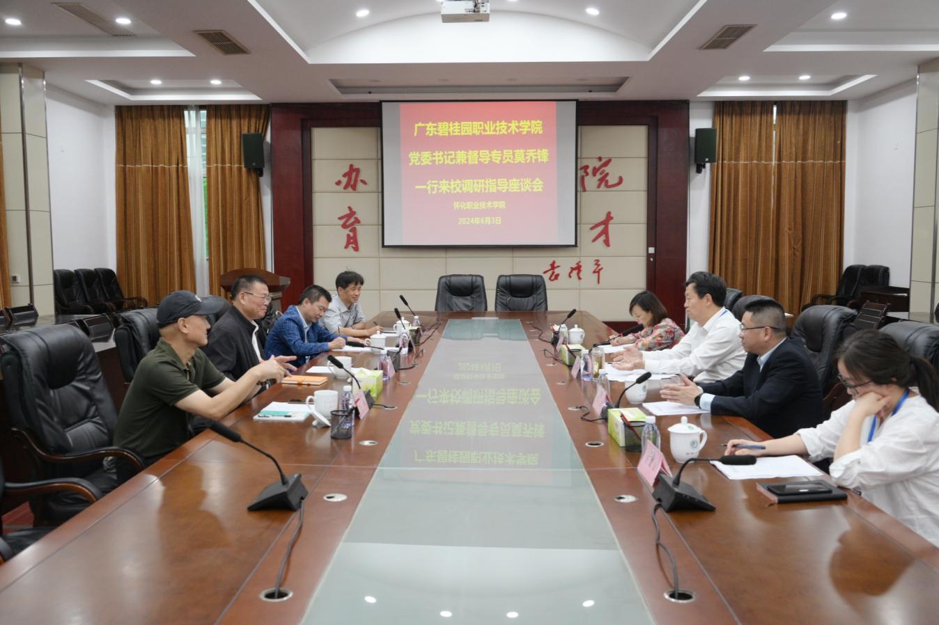 6月3日下午,广东碧桂园职业技术学院党委书记兼督导专员莫乔锋一行来校调研指导工作。座谈会在学校多功能厅会议室召开,校党委书记胡扬帆主持,校领导张云龙、李亚玲出席,思政课部负责人参加。